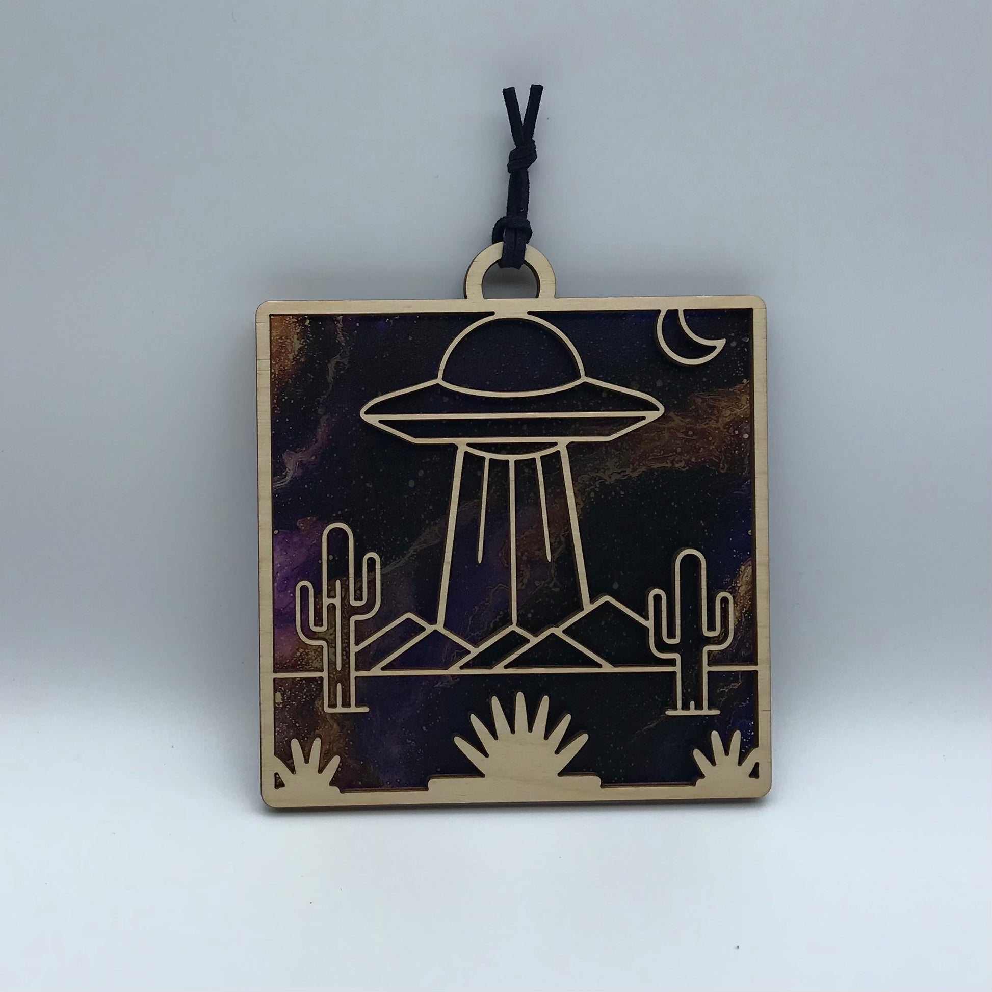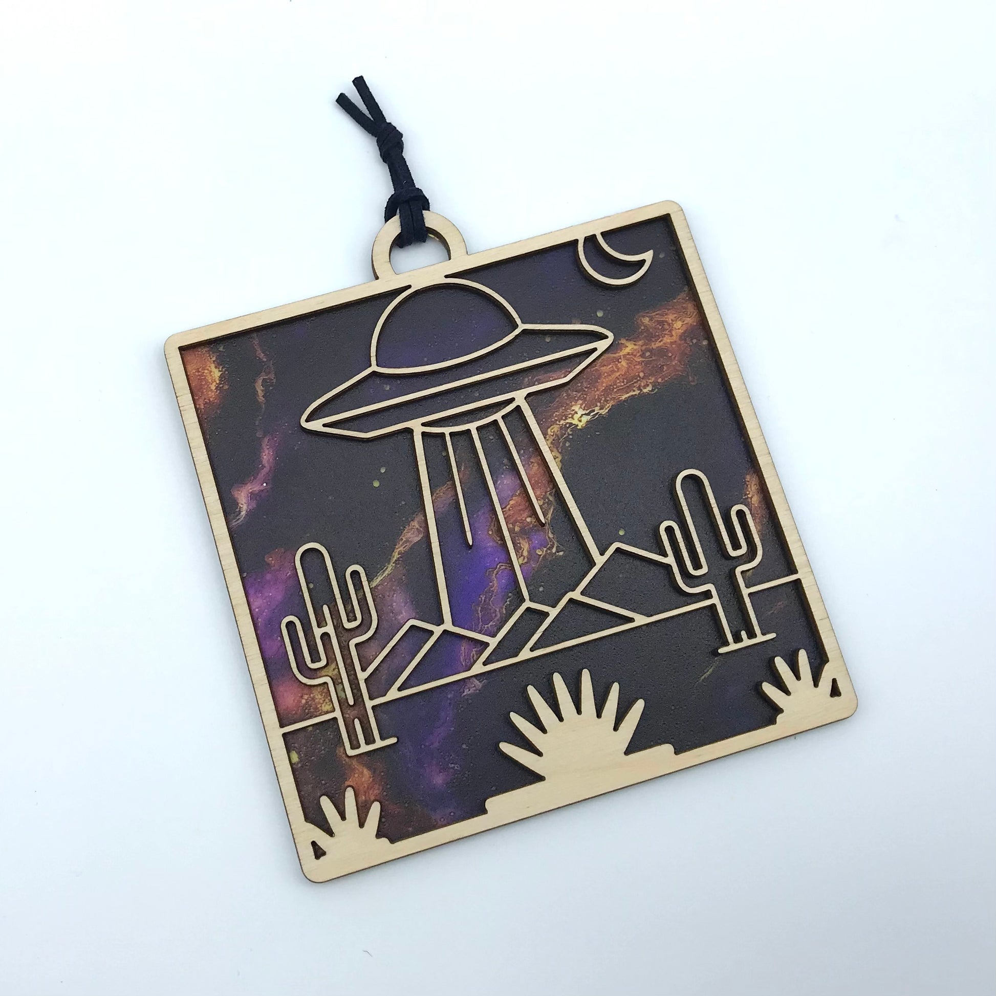 Wood/Acrylic. Indoor only. Comes with suction cup hook so you can hang it in your window or sliding door.