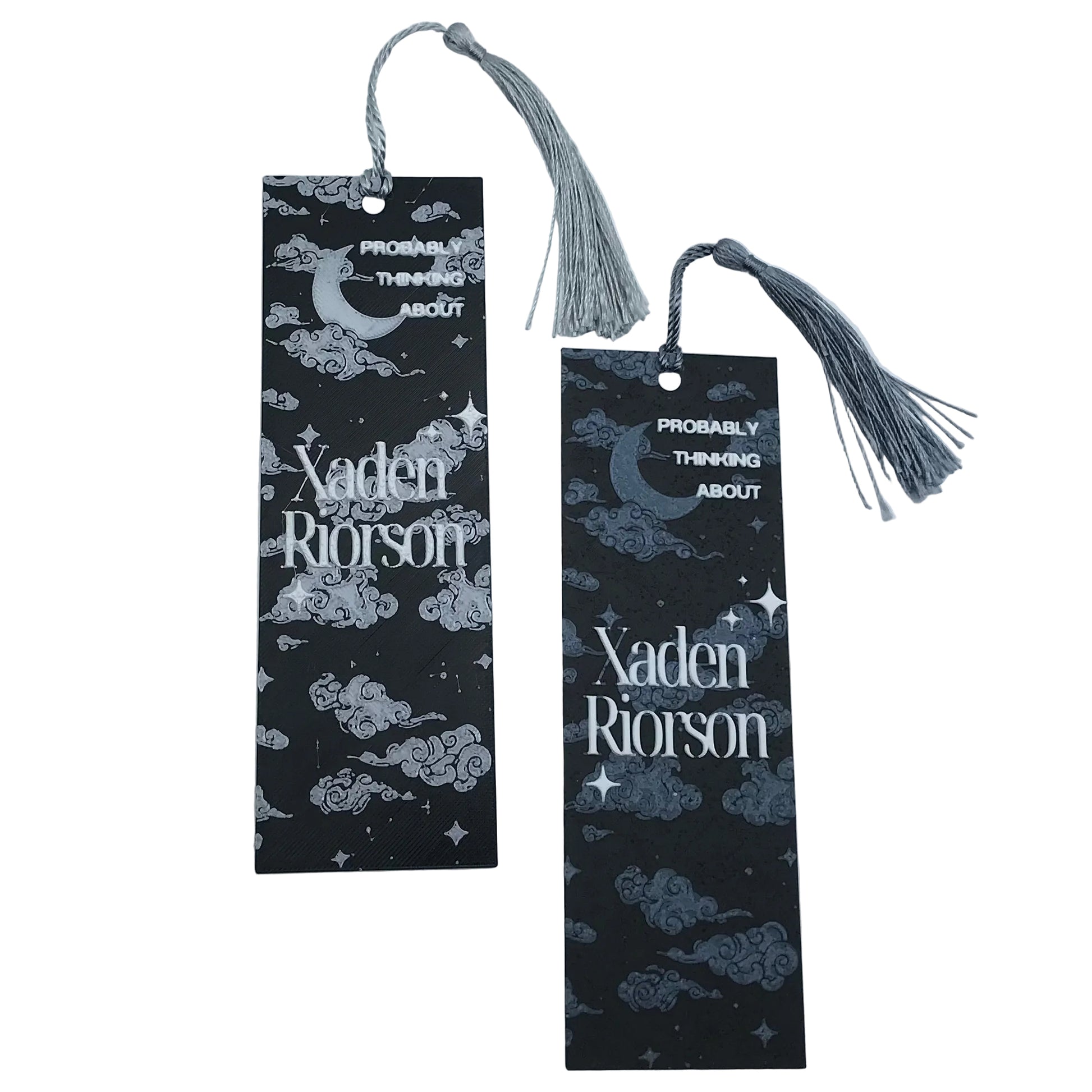 Our "Probably thinking about Xaden Riorson" bookmark is a fan favorite for Fourth Wing lovers. This bookmark is 3D printed and comes with a silver tassel. Available in Silver and Shadow.