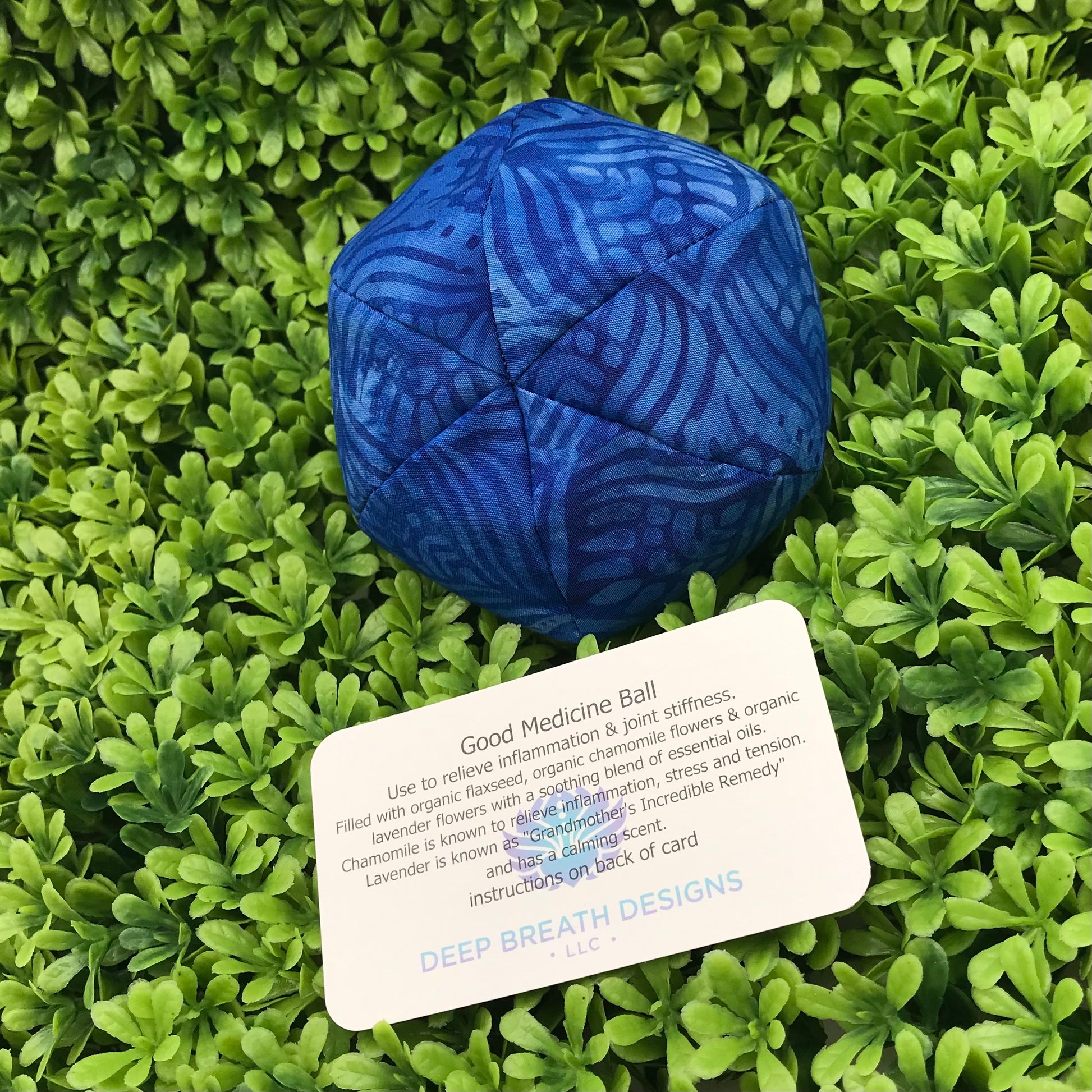 Used to relieve inflammation and joint stiffness. Cotton batik ball filled with organic flaxseed, herbs & a soothing blend of essential oils. Massage with hands, roll on neck or roll under feet, use on shoulders, elbows or knees. Use hot or cold.